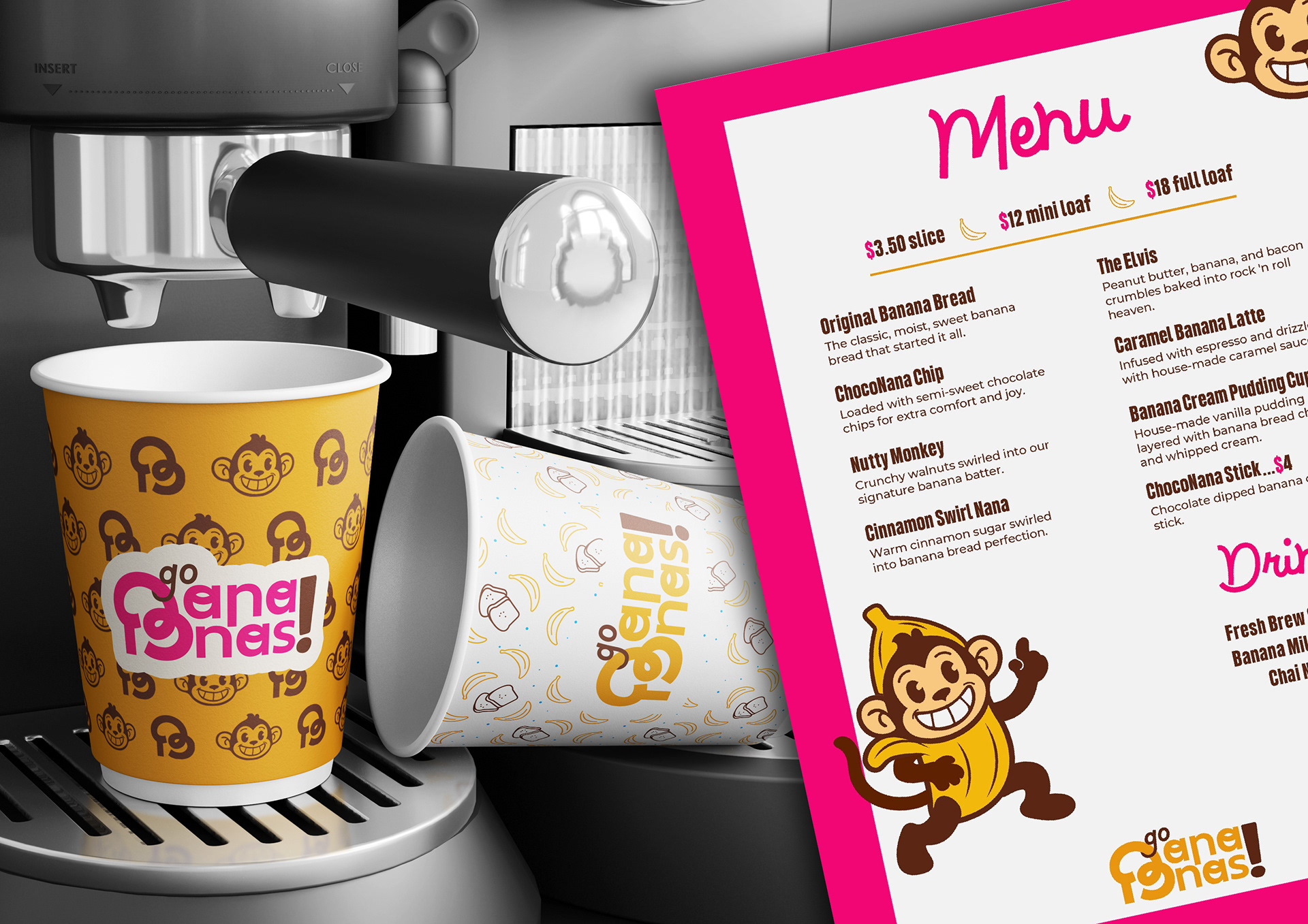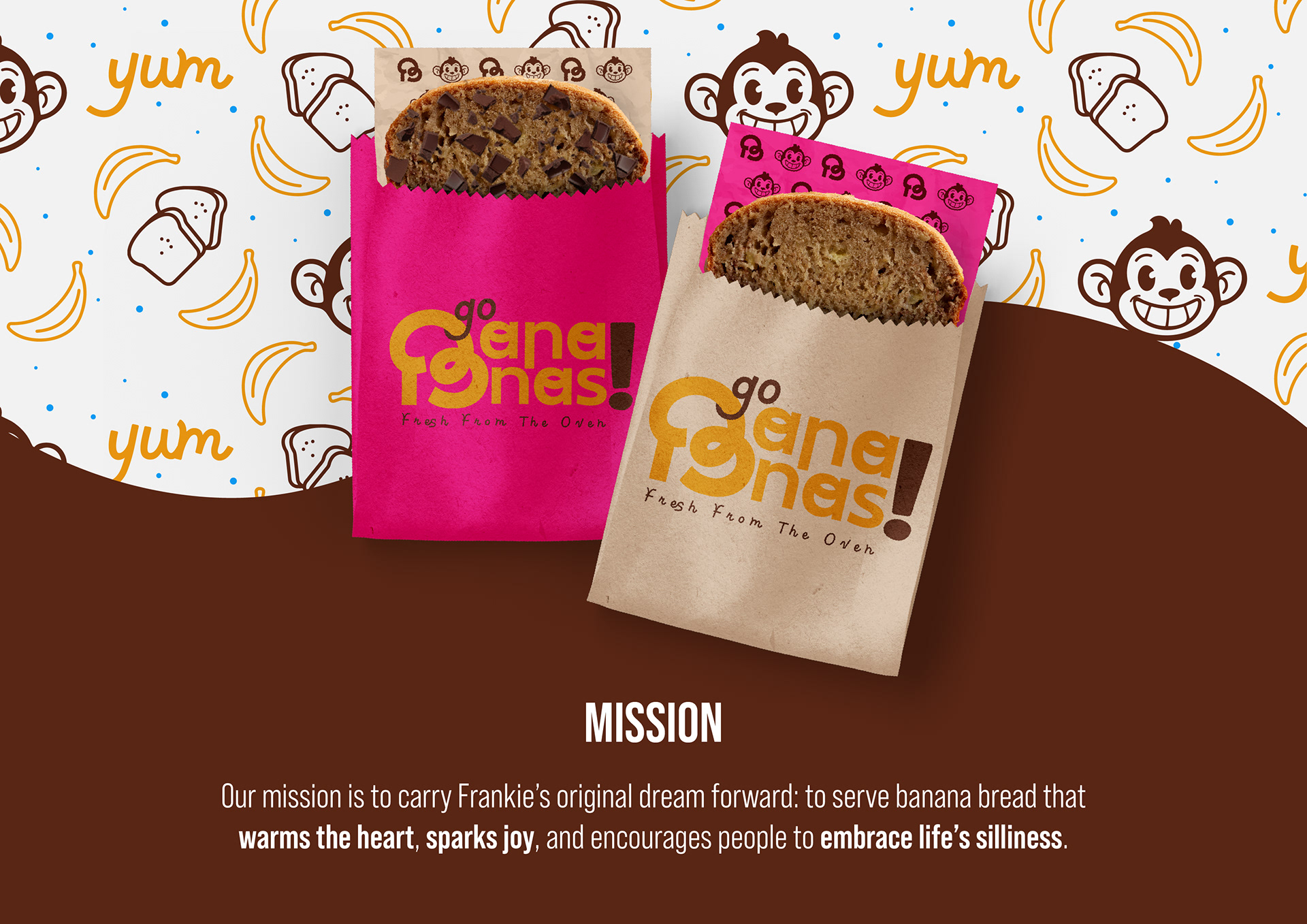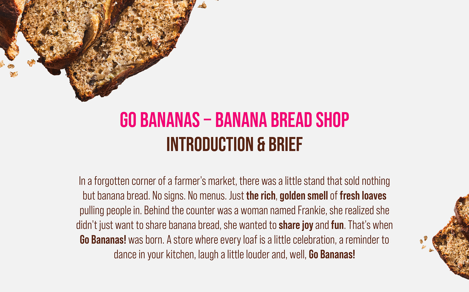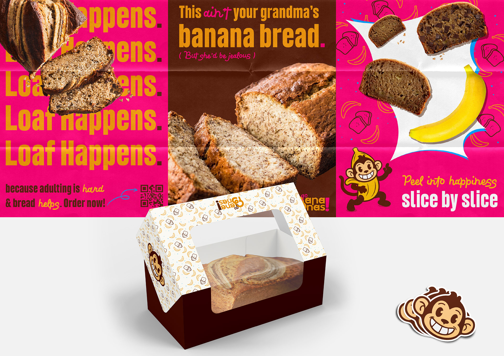This brand identity was created for Go Bananas!, a shop that believes banana bread should make you smile. The visuals reflect the brand’s playful spirit, warm storytelling, and its mission to spread joy one loaf at a time.